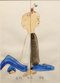Erek’s beating drums pulled visitors between the gardens of Shin’s stone tablets. In them, he “found fairytale epics from time immemorial, tales that speak of the gyriffyn, bearing news of the coming paradise, as well as the gyriffyn’s master, Queen Shyashya, and her daughter, Princess Shyashyahwa. They are accompanied by countless shyamyans and sprites, spirits and tenshyas, the inhabitants of the cyosmic forest.”5 Throughout the days of Natasha, the beings in the stones were perhaps in conversation with the creatures in Yass’s paintings, exchanging in ways we do not know nor imagine. The concept of exchange is familiar; its ways are always inventive. Koon Kwon’s painting reproductions of the stones are like enlarged portraits. Eyes traverse their terrain of painted textures and techniques, like impressions of a stone’s surface. Transient waterfalls appeared as light emitted from a projector, humongous stones were suspended high up on the wall, and wooden structures shook the space without moving an inch from where they stood.