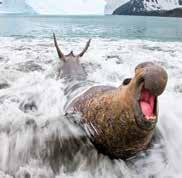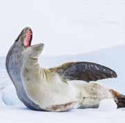 Fierce and felinelooking, leopard seals are named for their blackspotted coat and cat-like jaws. They are fast and ferocious hunters, ranking as Antarctica’s apex predator, along with orcas. Streamlined bodies help them rocket through water and chase prey at speeds of up to 25 miles an hour.