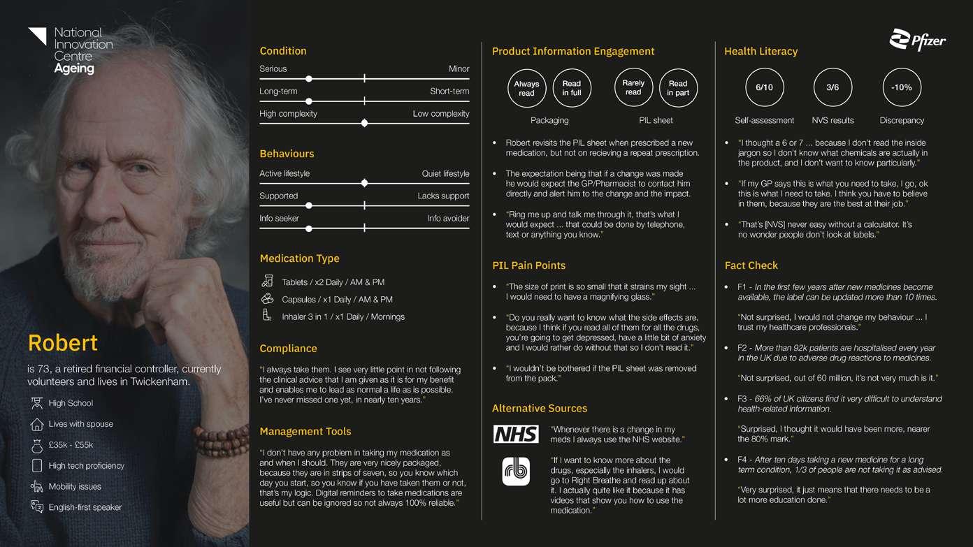 Condition Active lifestyle Quiet lifestyle Supported Lacks support Info seeker Info avoider Medication Type Tablets / x3 Daily / Mornings with breakfast Compliance • George ‘always’ takes his medication as prescribed. • “It has become a regular habit.” Health Literacy • “As my medication has remained constant I assume if there was any change in advice it would be drawn to my attention by either or both the GP or Pharmacy.” Product Information Engagement • “I feel the product information within the packets is just a waste of paper.” • “I mean to my mind it tells you what might happen, but if it hasn’t happened why do you want to know.” • “I think, more and more knowledge doesn’t necessarily make it easier to understand and I feel particularly sorry for people who read it and get worried.” • “Use of jargon and lengthy explanations doesn’t help.” PIL Pain Points is 94, a retired architect and lives in the North East of England. Bachelors degree Lives with spouse £15k - £35k Low tech proficiency English-first speaker Behaviours Serious Long-term Short-term High complexity Low complexity Minor Rarely read Packaging Read in part Never read PIL sheet N/A • “How much do I want to understand it? If I understood it 95%, would I be any better? If it isn’t worth the effort, why do it?” Fact Check • F1 - In the first few years after new medicines become available, the label can be updated more than 10 times. “Not surprised, If