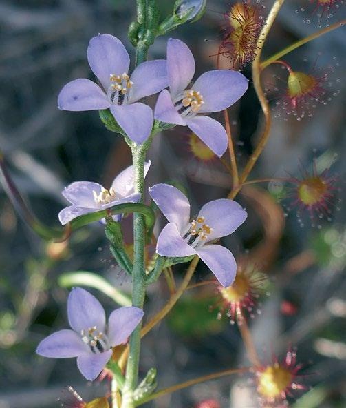 A thread-thin stalk of the Climbing Sundew snakes around the same twig, using it as a climbing ladder. The leaves are a perfect semi-sphere shape and around the rim, droplets of sticky trapping fluid on each maroon hair-like extension. Glistening. A green segment of Twining Fringe-lily stem makes one loop around the Boronia twig, cupping two petals as it passes, and then exits stage left.
