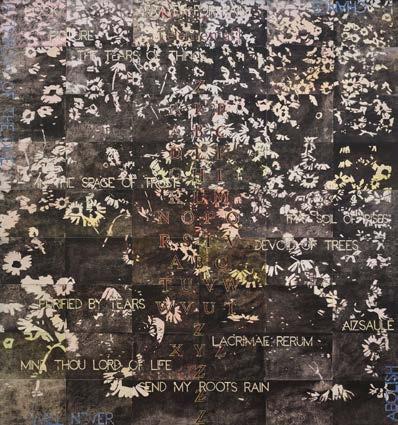 As the continent creaks under the constant impact of global warming, prolonged droughts will expand the threat of bushfire and threaten fragile eco-systems in marginal environments. In Prayer for rain 2020, Cooma-based artist Imants Tillers confronted his drought-stricken terrain. A field of native daisies in Prayer for Rain , at times struggle in sub-alpine conditions such as the Mount Kosciuszko region near the artist’s family home at Cooma. The work incorporates a quote attributed to the nineteenth-century English poet, G.M. Hopkins: MINE THOU LORD OF LIFE, SEND MY ROOTS RAIN. This quote could be read as a plea for the physical and spiritual essentials to sustain life in an arid land.