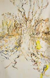 Entries from John Wolseley’s journal provide an insight into the artist’s inspiration and process: ‘While here in the Riverina, things seem to move towards something strangely primordial. In Study for what the world would be once bereft, of wet and wildness 9, 2021, it seems to me to have the feel of a winged and feathered pterosaur struggling to emerge out of the earth. Wolseley discovered on Bibbaringa that Gill Sanbrook, over time, has ‘evolved her land from a bare dumb-downed landscape to a rich fecund farm with complex vegetation and a darkly healthy soil, hydrated and swimming with microbial life.’