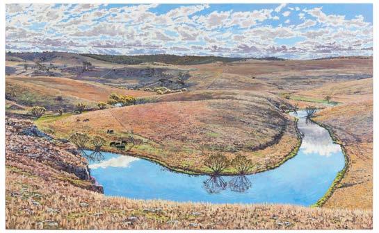 The painter Lucy Culliton has lived at Bibbenluke in the Snowy Monaro region of New South Wales for the past 17 years. Subjects for her paintings are drawn from the world around her, such as the ever growing garden and her menagerie of rescue animals and birds. Add to this, panoramic vistas beyond her property – vistas of regeneration that have inspired the artist over the past decade. The property she has closely observed stretches along the Cambalong Creek in Gunningrah belongs to her friend and neighbour Charlie Maslin, a regenerative farmer. In support of her painting, In Gunningrah 2025, the artist described the practice: ‘Livestock are rotated in cell paddocks so the grass has long breaks from the wear and tear of animals. Charlie has built leaky weirs along the creek so large ponds hold water longer in dry times. Grasses and reeds grow along the edges of the banks so erosion isn’t an issue. All good farming practices in my mind.’