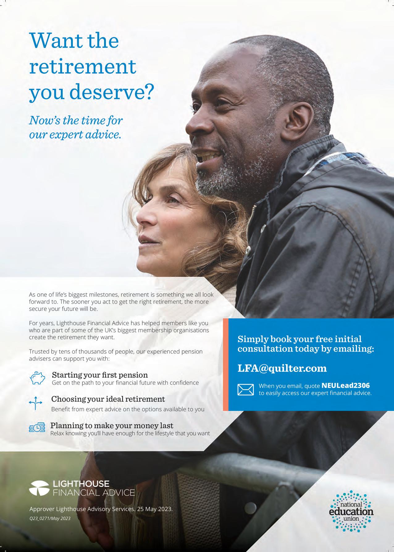 I have a strong sense that even the politicians are belatedly realising that things cannot carry on like this. And about time, I can hear you shouting! But of one thing you can be sure. Your union, the NEU, understands, values and supports the work done by all of its leadership members working in the most di cult circumstances, and it always will.