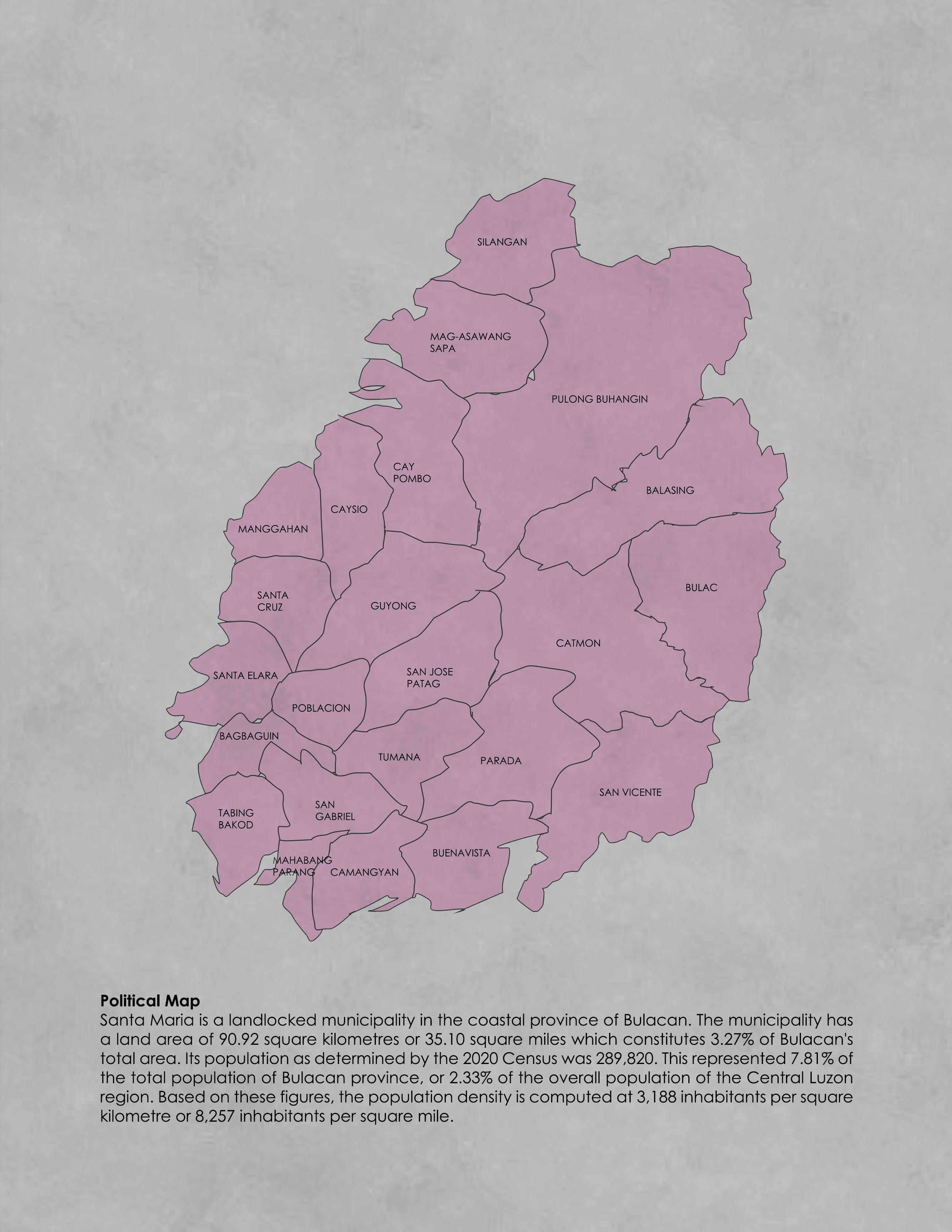 The municipality has a land area of 90.92 square kilometers or 35.10 square miles which constitutes 3.27% of Bulacan’s total area. Its population as determined by the 2020 Census was 289,820. This represented 7.81% of the total population of Bulacan province, or 2.33% of the overall population of the Central Luzon region. Based on these figures, the population density is computed at 3,188 inhabitants per square kilometer or 8,257 inhabitants per square mile.