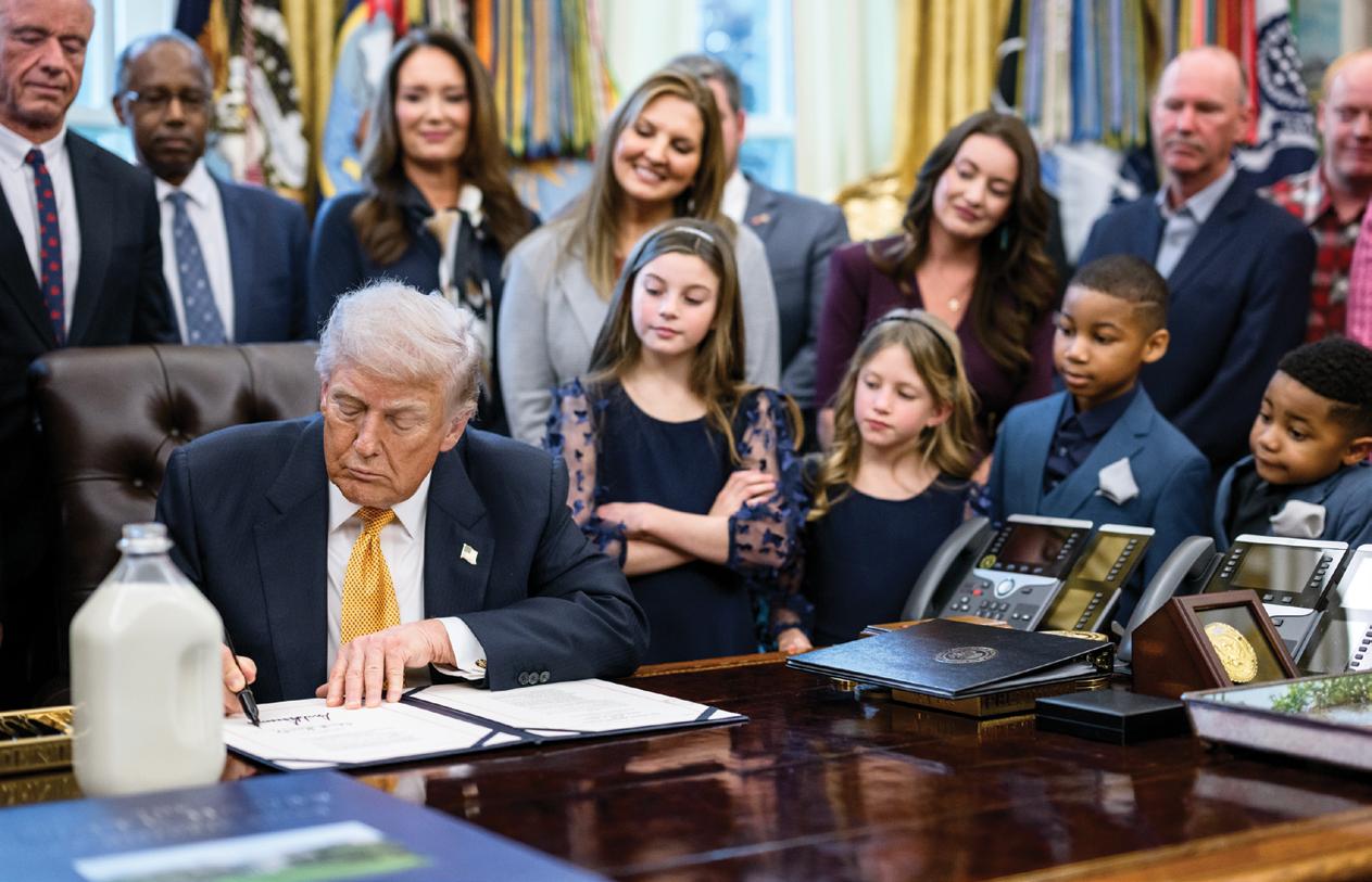 left: President Donald Trump signs the Whole Milk for Healthy Kids Act into law.