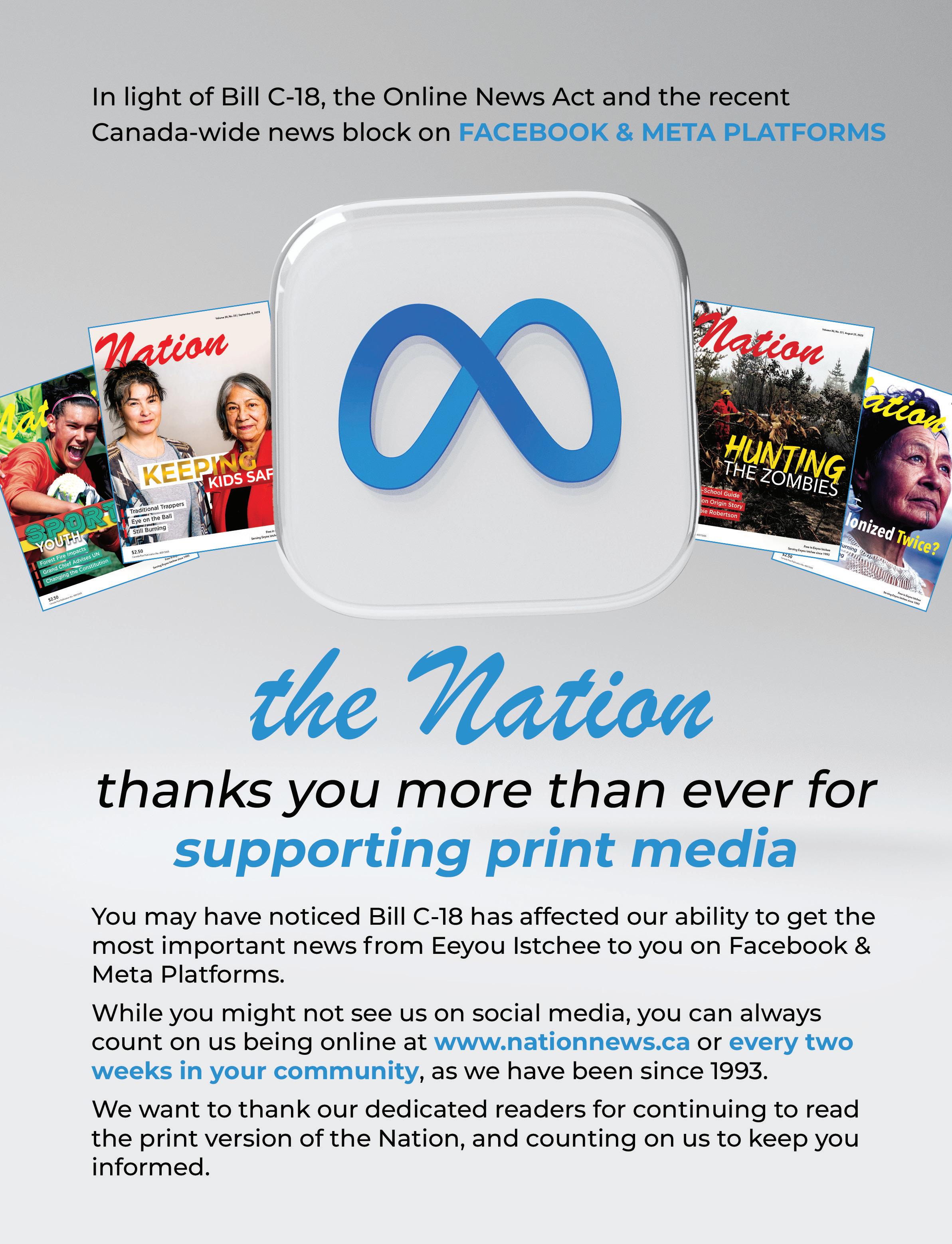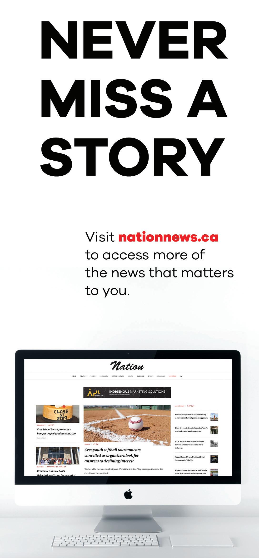 The Nation is published every two weeks by Beesum Communications EDITORIAL BOARD L. Stewart, W. Nicholls, M. Siberok, Mr. N. Diamond, E. Webb EDITOR IN CHIEF Will Nicholls DIRECTOR OF FINANCES Linda Ludwick EDITORS Lyle Stewart, Martin Siberok PRODUCTION COORDINATOR AND MANAGING EDITOR Randy Mayer CONTRIBUTING WRITERS S. Orr, X. Kataquapit, P. Quinn J. Janke DESIGN Matthew Dessner SALES AND ADVERTISING Danielle Valade, Donna Malthouse THANKS TO: Air Creebec CONTACT US: The Nation News, 918-4200 St. Laurent, Montreal, QC., H2W 2R2 EDITORIAL & ADS: Tel.: 514-272-3077, Fax: 514-278-9914 HEAD OFFICE: P.O. Box 151, Chisasibi, QC. J0M 1E0 www.nationnews.ca EDITORIAL: will@nationnews.ca news@nationnews.ca ADS: Danielle Valade: ads@nationnews.ca; Donna Malthouse: donna@beesum.com SUBSCRIPTIONS: $60 plus taxes, US: $90, Abroad: $110, Payable to beesum communications, all rights reserved, publication mail #40015005, issn #1206-2642 The Nation is a member of: The James Bay Cree Communications Society, Circle Of Aboriginal Controlled Publishers, Magazines Canada Quebec Community Newspaper Assn. Canadian Newspapers Assn. Les Hebdos Sélect Du Québec. Funded [in part] by the Government of Canada. | www.nationnews.ca | facebook.com/NATIONnewsmagazine | Twitter: @creenation_news CMC A AUDITED Editorial by