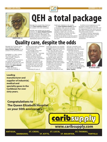 services to the public of Barbados (and elsewhere) and with excellent outcomes. This package covers most disease conditions from âthe brain to the toeâ â neurology to footcare â with only a few medical conditions referred overseas for further treatment. During this year of celebrations, we wish to show immense appreciation and thanks to the employees, volunteers, boards of management, and our health partners, who have served this institution with distinction and support. Celebrating 50 years of