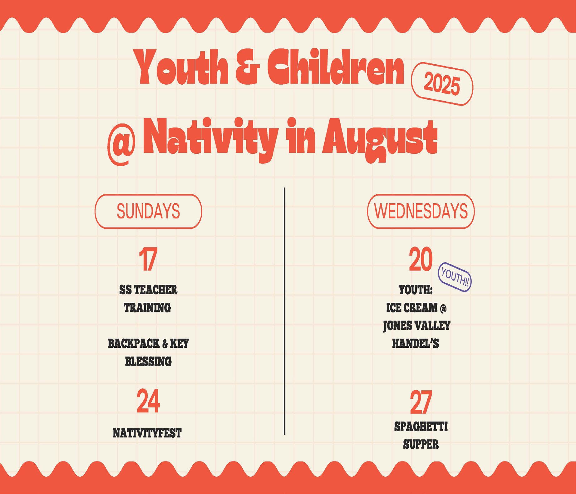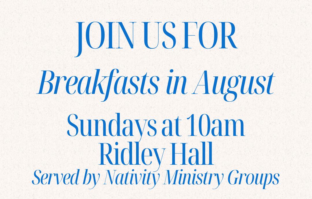 Come enjoy breakfast every Sunday in August during the formation hour (10am). Nativity ministries will be serving breakfast. On August 10th, we will have one big ministry fair where you can see what our ministries have to offer!