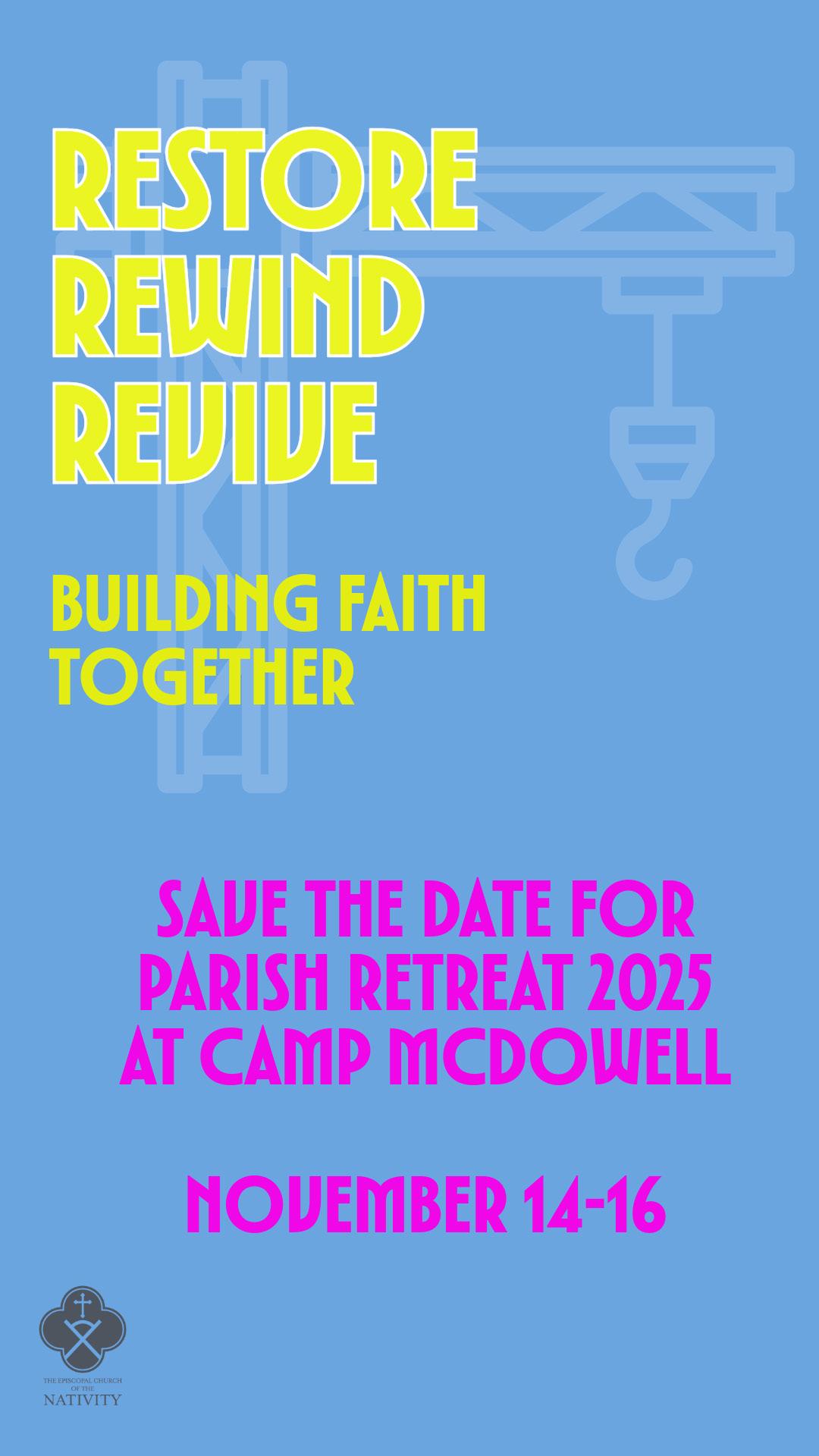 Save the date for Nativity Parish Retreat! For the first time in five years, we’re returning to Camp McDowell for our parish retreat! We hope you’ll join us in rekindling this beloved tradition of family fun at Wonderful, wonderful Camp McDowell.