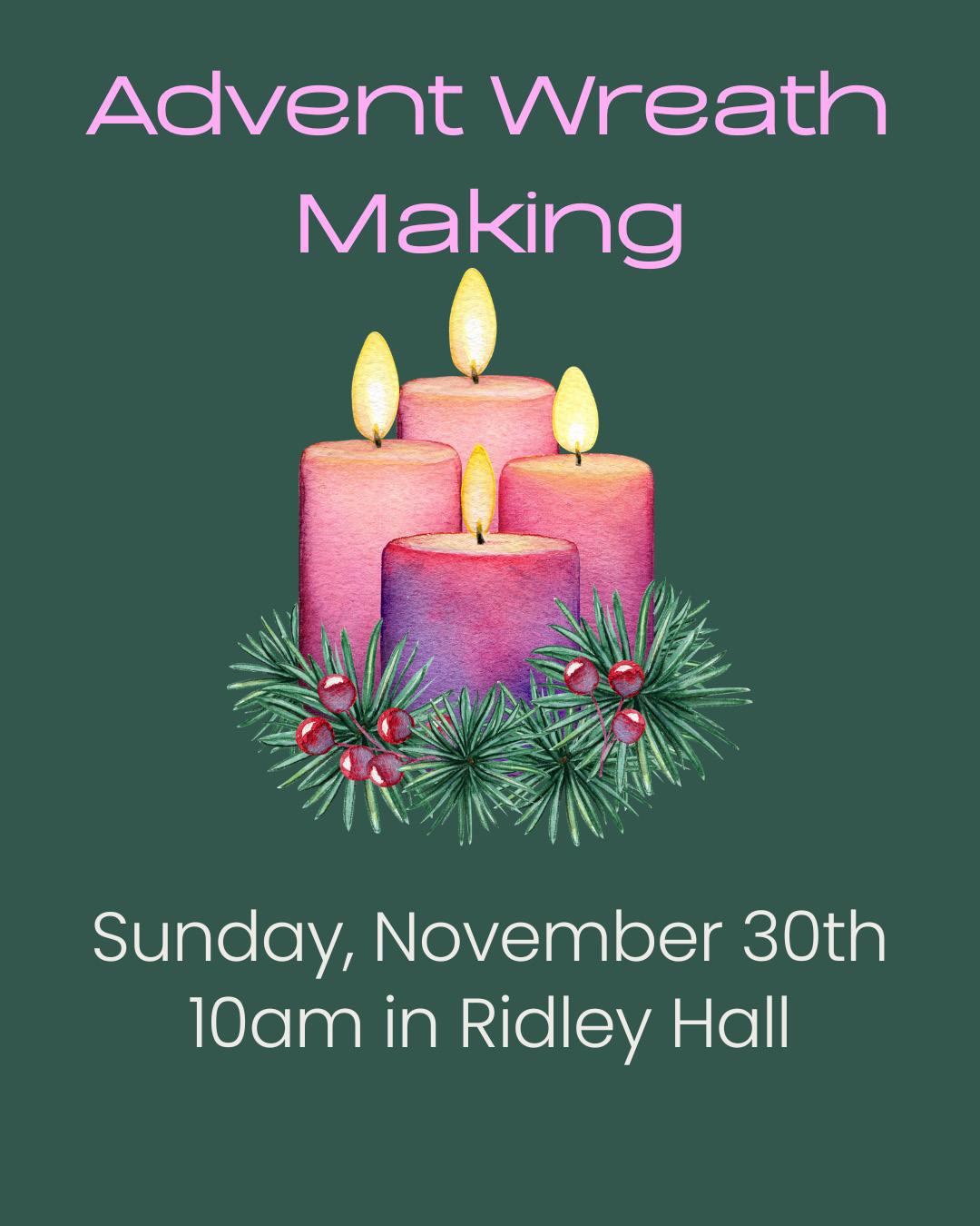 Join us Sunday, November 30th as we make Advent wreaths for the first Sunday in Advent! Please bring your own greenery and some to share if you are able. Donations of $10 are appreciated but not required. One per family, please!