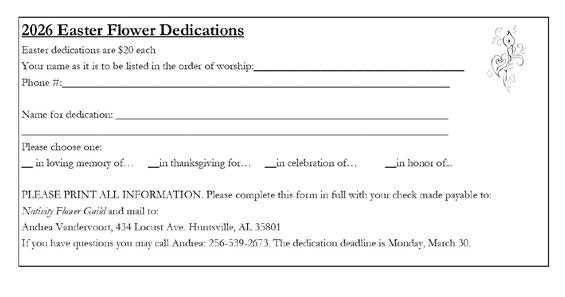 Easter Flower Dedications will open March 8th! Flower dedications are $20 each and may be submitted using the QR code, or by filling out a form. The forms will be located in the Banister room on the table next to the drink cooler, the table next to the Chapel interior entrance or the foyer of the Nave. The deadline to submit a Christmas Flower Dedication is March 30th.