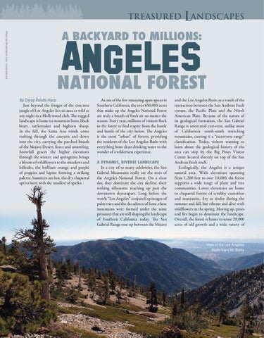 ngeles A National Forest By Darcy Poletti-Harp Just beyond the fringes of the concrete jungle of Los Angeles lies an area as wild as any night in a Hollywood club. The rugged landscape is home to mountain lions, black bears, rattlesnakes and bighorn sheep. In the fall, the Santa Ana winds come rushing through the canyons and down into the city, carrying the parched breath of the Mojave Desert, fierce and unsettling. Snowfall graces the higher elevations through the winter, and springtime brings a bloom of wildflowers to the meadows and hillsides, the brilliant orange and purple of poppies and lupine forming a striking palette. Summers are hot, the dry chaparral apt to burn with the smallest of sparks.