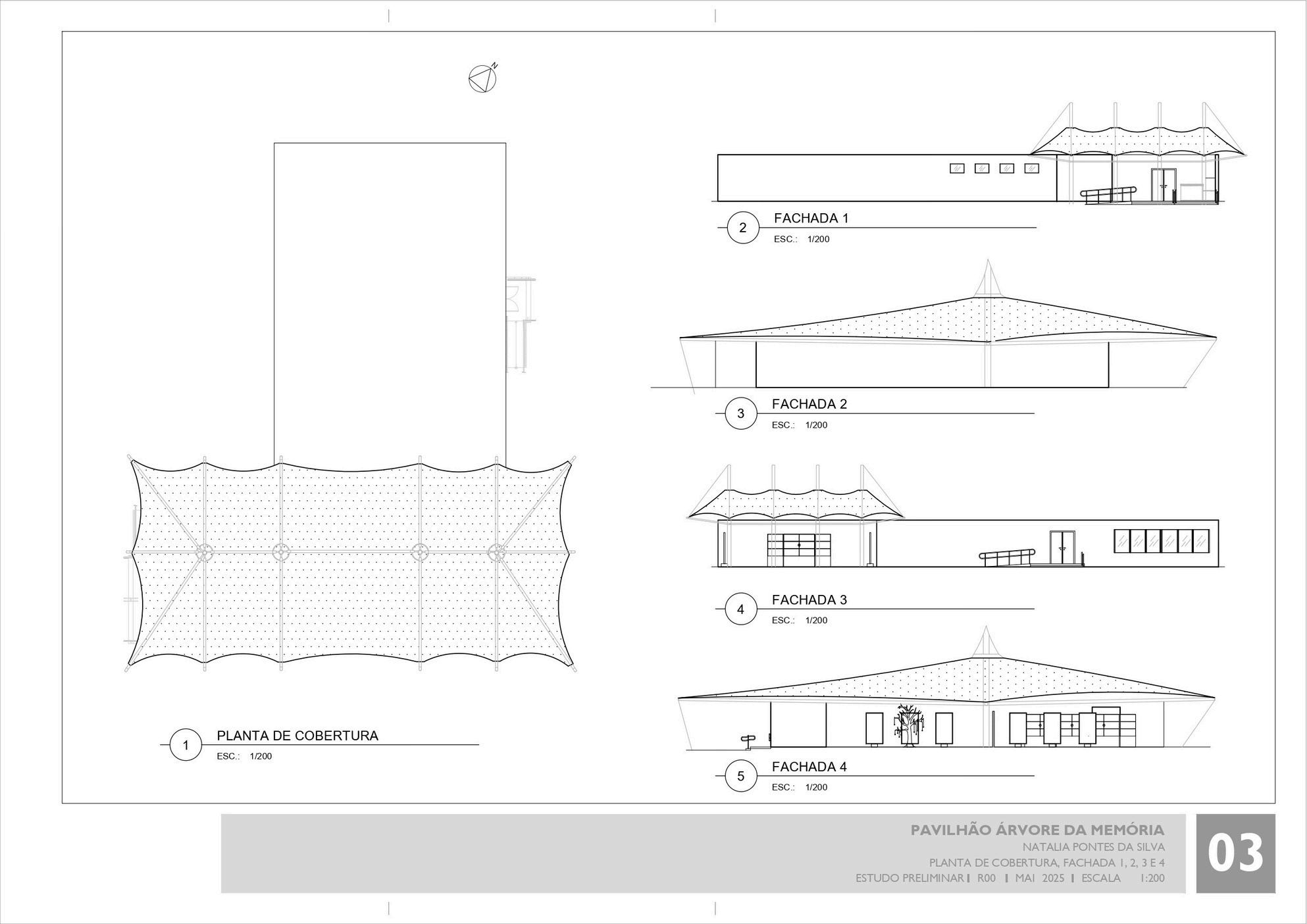 Na cobertura, será adotado um sistema de telas tensionadas feitas com tecido reciclado, concebido para simular a copa de uma árvore, funcionando como um abrigo leve e fluido, inspirado nas comemorações que acontecem no parque, onde as pessoas naturalmente buscam a sombra das árvores para se reunir, descansar e celebrar. Essa solução traz uma referência simbólica e sensorial ao uso do espaço ao ar livre.
