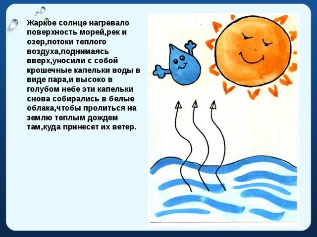 испаряются, т.е. превращаются в пар. Вечером, мама мне рассказала сказку про одну капельку, которая жила в большом озере и вокруг плавали такие же капельки