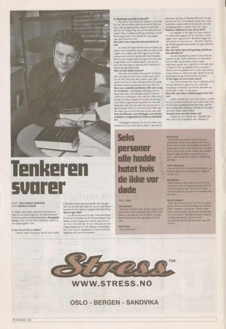 ikke bare feil, den er tåpelig. Når man for ek sempel ser inn i sin elskedes øyne lever man autentisk i ordets rette forstand, seiv om det selvfølgelig ikke er døden man ser i dem. Døden er allikevel en stor del av livet? - Ja, lengden vi har igjen av livene våre er for eksempel avgjørende for hvordan vi plan legger dem. Jeg som er i 40-årene legger andre planer enn du som er i 20-årene. Banker og forsikringsselskaper skjeler jo også sterkt til slike detaljer. Men når døden fører til ingenting, eksisterer den egentlig da? - Ja, den eksisterer og fører til at vi ikke eksisterer lenger. Selve tilstanden av ikke-eksis tens er ikke noe problem. Den er bare ingenting, og det var vi også før vi ble født. Det er tapet av livet og følgelig det at vi slutter å være til som subjekter som er det onde. Det er erkjennelsen av dette som gjør døden til en så skjellsettende og problematisk hendelse. Er det ingen vei ut av dette uføret? - I en viss forstand har man muligheten til å tre inn i andres liv gjennom ens verk eller handlinger. Arkitekter, kunstnere, filosofer og andre gjør jo det i en viss grad. Men hvis man ikke er Michelangelo eller Pla ton? - Også mentalt kan man leve videre i andres liv. Ens psykiske tilstander, som f.eks idéer, kan bli til andres psykiske tilstander. Men det blir vel en fattig trøst så lenge det ikke er ens eget seiv som bærer dem videre. Hvordan lever du med døden, da? - Døden er som dårlig vær. Jeg liker den ikke, men må jo håndtere den allikevel. 0