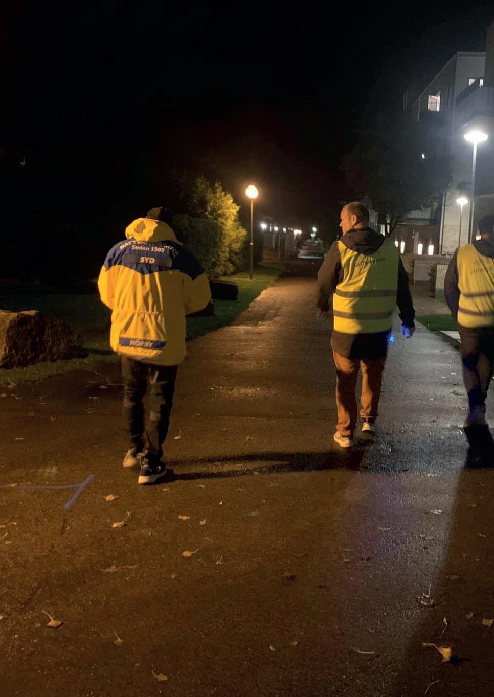 vandringarna. Vi har fått mycket stöttning från organisationens ansvariga i region Syd vid uppstarten och det märks att nattvandring är ett välkänt och beprövat koncept som alla känner till. En lite oväntad bonus har varit alla nya trevliga grannar som man fått chansen att gå och prata med under vandringarna. Fäladsandan frodas!