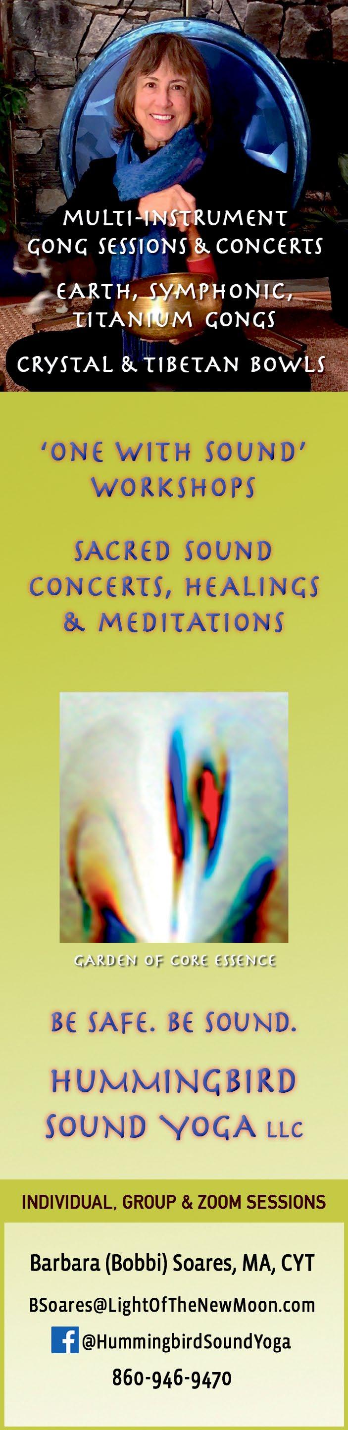 Barbara (Bobbi) Soares, MA, CYT, is a sound yoga and vocal yoga teacher, blues/jazz singer, and Reiki master, certified in several modalities of energy and sound healing. She offers Hummingbird Sound Yoga and sound healing immersions for groups and private sessions. Using earth, dance and symphonic gongs, bowls, tuning forks and humming-for-health meditations, her goal is to help individuals experience becoming “one with sound” to promote a deep relaxation response that balances energy and encourages healing. See ad, page 6.