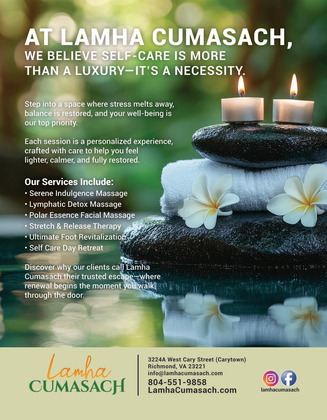 Nurturing the Body, Restoring the Mind, Elevating Your Wellbeing. Discover restorative massage therapy designed for total wellbeing. From deep pain relief and stress reduction to prenatal and postpartum care, each session is personalized to your body’s unique needs. Choose from indulgent experiences like the Serene Indulgence Intro Massage, Bespoke Wellness Massage, or Lymphatic Detox Massage—all crafted to relieve tension, promote healing, and leave you feeling refreshed and rebalanced. Because you can’t pour from an empty cup — it’s time to prioritize you. See ad, page 16.
