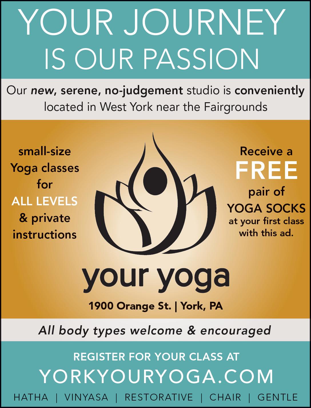 Your journey is our passion at Your Yoga. We welcome everyone to learn in a safe, inviting, no judgment studio located near the fairgrounds. All body types welcome. Easy access with lots of free on-street parking. Hatha, Vinyasa Flow, Restorative, Chair and Gentle Yoga. See ad, page 6. u