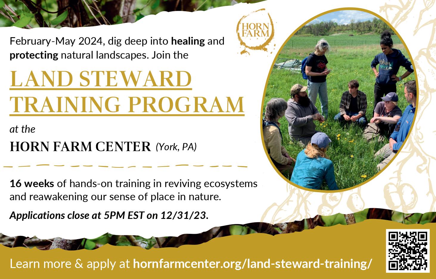 The 2024 Horn Farm Center Land Steward Training program will take place weekly on four Sundays from February 11 to March 3, followed by 12 Tuesdays from March 5 to May 21. Applications are due by December 31, with earlybird discount pricing by November 30.