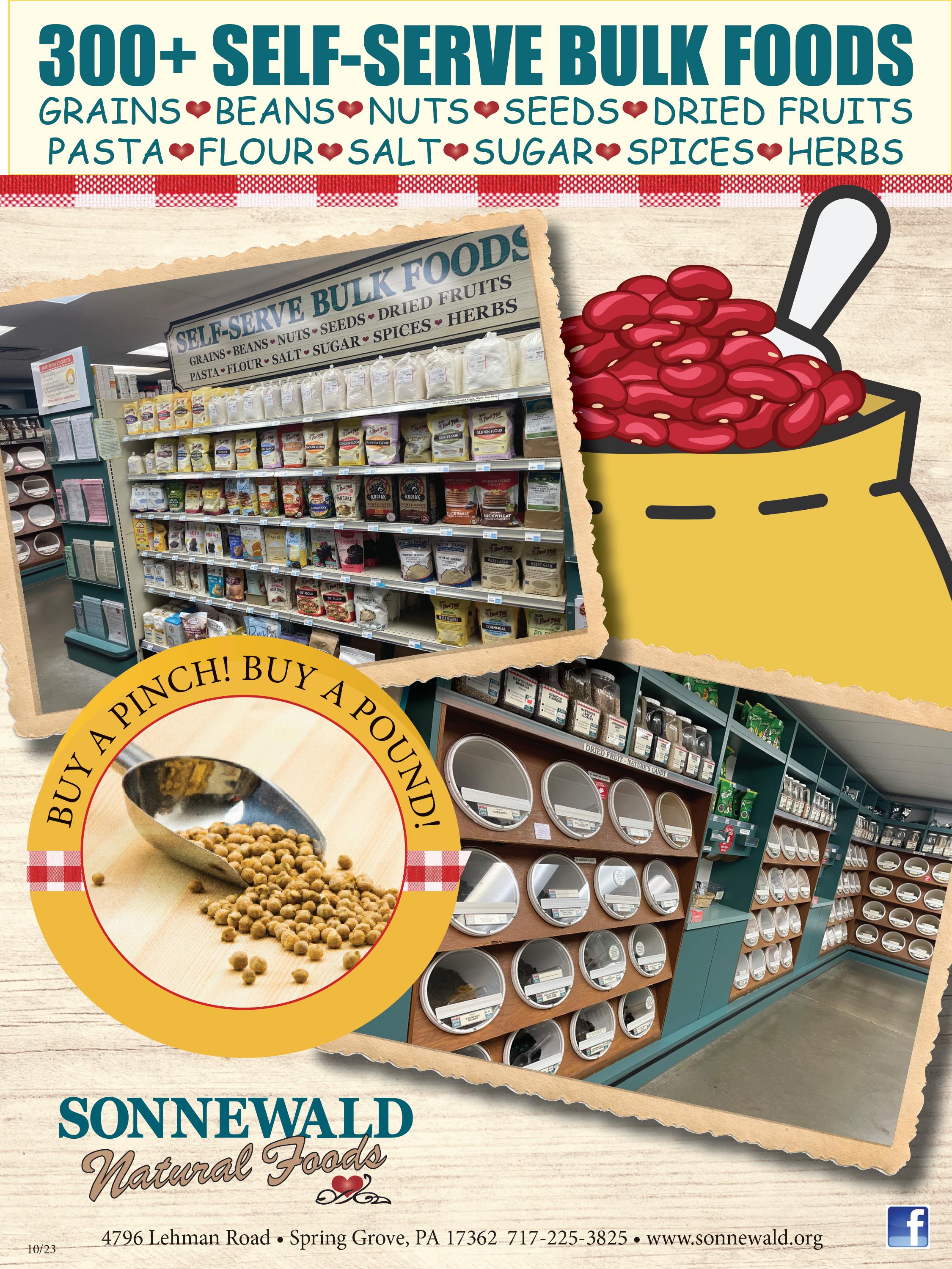 Good health comes from the farm...Not the Pharmacy! Sonnewald Natural Foods has 300+ bulk foods, organic produce, supplements, books and more, and has been in business for more than 60 years, serving Central PA and beyond. Follow us on Facebook for daily, weekly and monthly offers and special events u In-store Nature’s Marketplace features natural foods, supplements, herbal remedies, and foods for special dietary needs. See ad, page 2. u