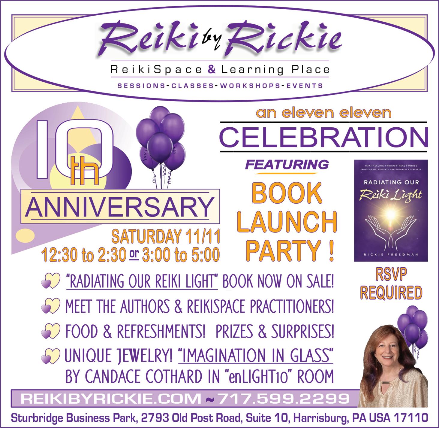 OnNovember 11, Rickie Meryl Freedman is celebrating the 10-year anniversary of Reiki by Rickie ~ ReikiSpace & Learning Place and the launch of her newest book: Radiating Our Reiki Light ~ Reiki Healing through Real Stories for Client, Students, Practitioners and Teachers. There are two shifts; from 12:30 to 2:30 p.m. and 3 to 5 p.m.