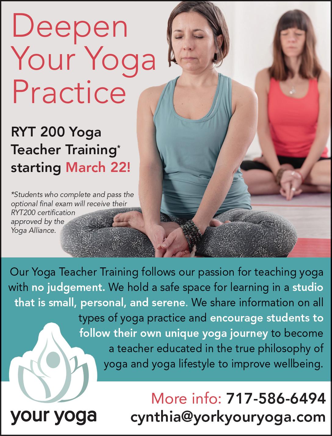Location: 1900 Orange St., York. For more information, 717-586-6494, email Cynthia@YorkYourYoga.com or visit YorkYourYoga.com. See ad, page 3.