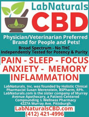 A Compounding Pharmacy Boutique, Pittsburgh's Pet Pharmacy, and home to LabNaturals CBD. We offer holistic health services—hormone balancing and consultation, pharmacist picked supplements, detox, nutritional counseling, absorbable acetylated and palmitated Glutathione products, and pharmacist- compounded CBD products for people and pets. We are a very specialized compounding only pharmacy and we compound anything that is not one-size-fits-all. Check us out online today. See ad, page 3.