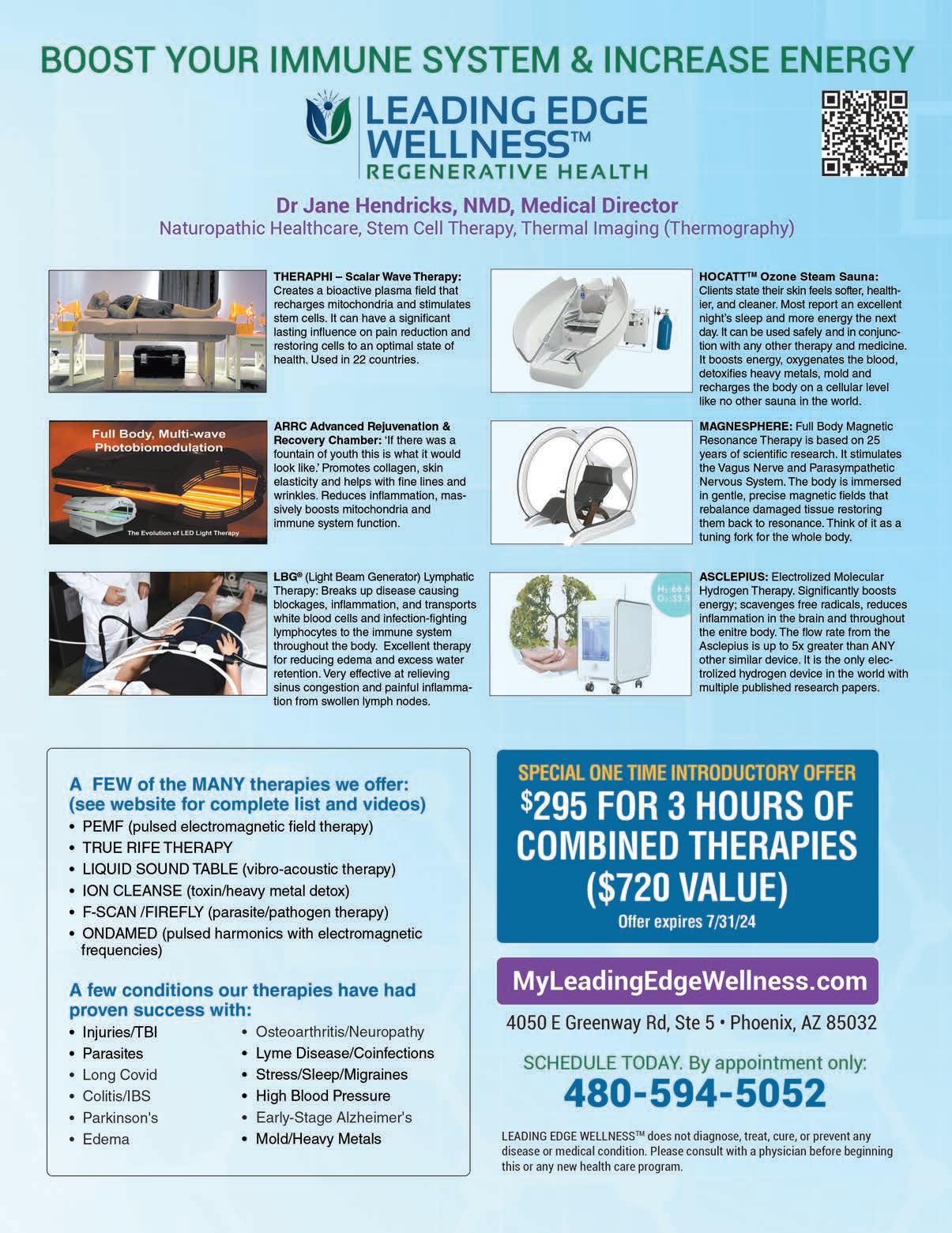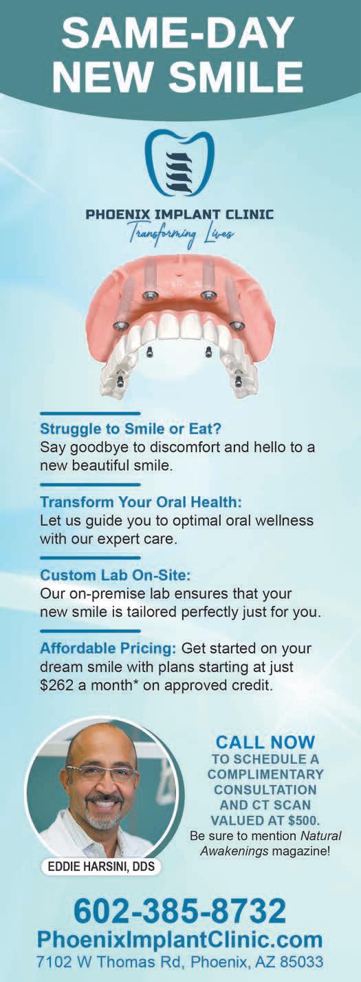 ONLINE EXCLUSIVES NaturalAZ.com VISIT US ONLINE @ Find additional articles online at NaturalAZ.com. Go to the homepage and explore local businesses and articles exclusively from Natural Awakenings SHARE YOUR COMMENTS JOIN US ON: COMMUNITY SPONSORS MyNaturalDentist.com Natural Dental Partners SWIHA.edu HEALTHY LIVING | HEALTHY PLANET FREE Keep It Cool JULY 2024 METRO PHOENIX & NORTHERN ARIZONA EDITION Calendar Check out the latest events at NaturalAZ.com/calendar MyLeadingEdgeWellness.com Mark J. Tager on Secrets to a Glowing Complexion Global Briefs Sperm Defy Newton’s Law of Motion Coffee Alternatives Remnants of Another Planet in Earth’s Mantle Health Brief