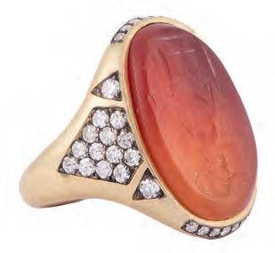 From a young age, Auclert collected antiques, even working at the Paris flea markets before moving into jewelry, where he worked for De Beers and Chanel, before establishing his own Maison Auclert. He sources intaglios, cameos, and coins from the Greek, Hellenistic, and Roman periods, along with Egyptian and pre-Columbian artifacts. His unconventional settings include a first-century BCE gold Celtic coin surrounded by diamonds in a bold ring that underscores the contrast between the warm, patinaed yellow gold coin and the high-sparkle stones.