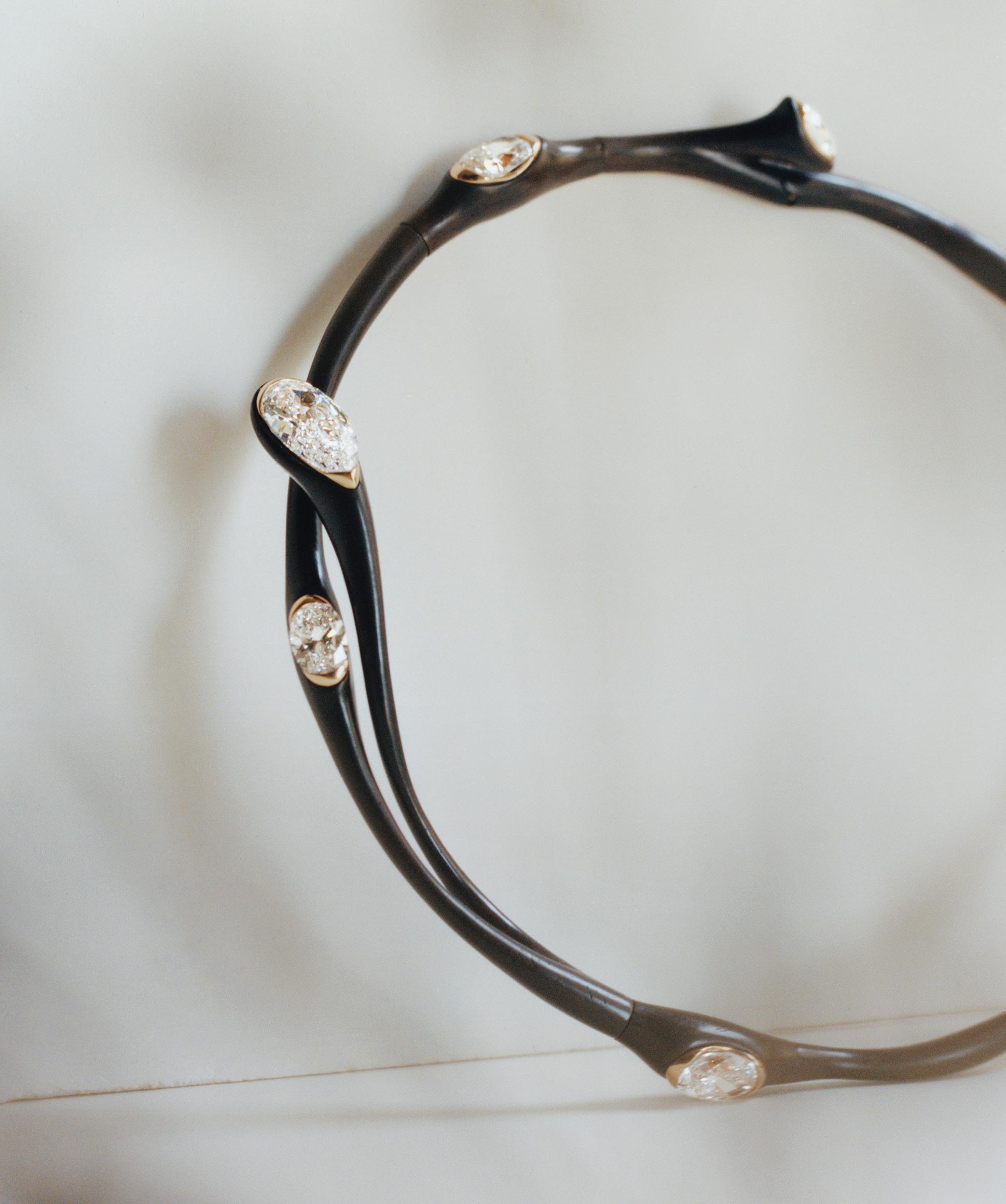 I am obsessed with cufs. I normally wear five at a time. They were inspired by gold Victorian memorial cufs that often have black enamel. I only make them in my rose gold which is an alloy I spent 18 months creating to get just the right color. It is soft without too much red.