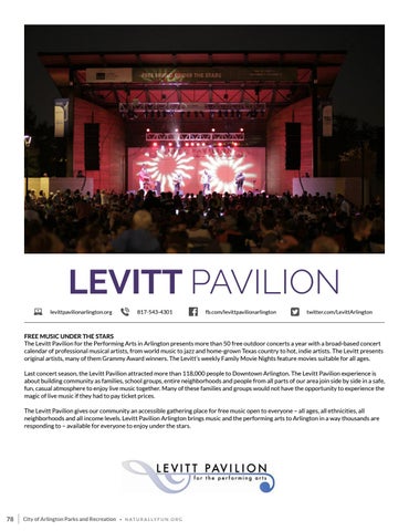 FREE MUSIC UNDER THE STARS The Levitt Pavilion for the Performing Arts in Arlington presents more than 50 free outdoor concerts a year with a broad-based concert calendar of professional musical artists, from world music to jazz and home-grown Texas country to hot, indie artists. The Levitt presents original artists, many of them Grammy Award winners. The Levitt’s weekly Family Movie Nights feature movies suitable for all ages. Last concert season, the Levitt Pavilion attracted more than 118,000 people to Downtown Arlington. The Levitt Pavilion experience is about building community as families, school groups, entire neighborhoods and people from all parts of our area join side by side in a safe, fun, casual atmosphere to enjoy live music together. Many of these families and groups would not have the opportunity to experience the magic of live music if they had to pay ticket prices. The Levitt Pavilion gives our community an accessible gathering place for free music open to everyone – all ages, all ethnicities, all neighborhoods and all income levels. Levitt Pavilion Arlington brings music and the performing arts to Arlington in a way thousands are responding to – available for everyone to enjoy under the stars.