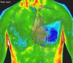 Medical Thermography is used as a preventative test that can see both hyperthermia and hypothermia (hot is red and cold is blue) and “dysfunctional” asymmetrical blood flow patterns. A reduction of blood flow to the heart causes temperatures to be cold. Hypothermia (too cold) pattern is normally seen in the left lower upper back, and left chest front view for heart concerns in females. Heart concerns for males are evaluated as hypothermia (too cold) pattern seen in the left chest front view.