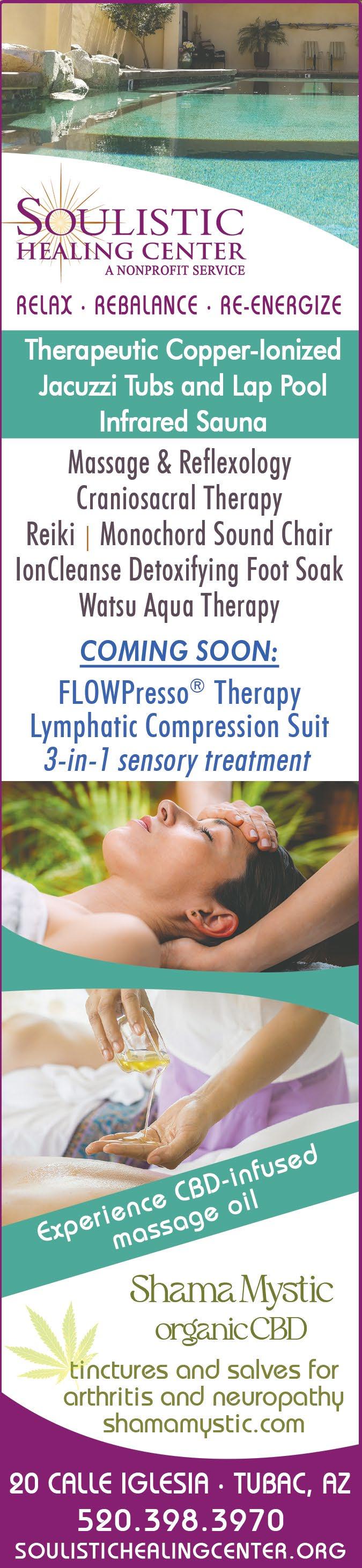 and lap pool for pain management of arthritis and other ailments. Soak, swim laps, meditate, rejuvenate, and unwind in five chlorine-free mineral healing pools. Detoxify in the far infrared sauna. Soulistic Healing Center, Tubac, 520-398-3970. SoulisticHealingCenter.org.
