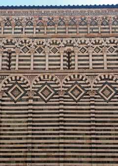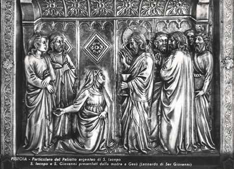 alla fiancata sinistra del dossale, troviamo il PALIOTTO LATERALE SINISTRO, opera di Francesco Niccolai e di Leonardo di Ser Giovanni, realizzata nel 1361 e raffigurante le storie del Vecchio Testamento che dall’alto verso destra raffigurano la creazione di Adamo ed Eva, il peccato e la cacciata dal Paradiso Terrestre, l’uccisione di Abele e Caino rimproverato dal Signore, Noè benedetto dal Signore e la fabbricazione dell’arca, Noè e i figli benedetti dal Signore e il sacrificio di Isacco, Mosè e le leggi, David che interroga il Signore e la sua incoronazione, la natività della Vergine e l’andata al tempio e lo sposalizio della Vergine. Si tratta di un paliotto minore ma che dialoga armonicamente con il paliotto principale anche grazie alla presenza di smalti rotondi e polilobi ricorrenti intorno alla sua fascia perimetrale e che raffigurano dall’alto il profeta Samuele, due stemmi di Pistoia e S. Paolo apostolo, in basso S. Zeno, due angeli e una rosetta sostitutiva, a destra un angelo e un santo non decifrabile e a sinistra S. Lorenzo e S. Mattia. Se poi ci spostiamo sul lato opposto esaminando la FIANCATA DESTRA dell’altare, ovvero il lato sinistro di chi osserva frontalmente questo capolavoro medievale, ci troviamo ad esaminare le parti più vigorose per espressione e per perfezione di lavoro di tutto il monumento. Lo sono certamente la figura sommitale del fianco del dossale di S. Luca che scrive e le due figure di S. Agostino e S. Gregorio Magno, potenzialmente attribuite nientemeno che ad un giovane Filippo Brunelleschi, a cui appartengono invece con certezza i due profeti Geremia e Isaia a mezzo busto inseriti nel basamento in formelle polilobe. È attribuito invece alla mano di Domenico da Imola il San Girolamo inserito nella prima nicchia sopra al basamento. E poi, sotto alla fiancata destra del dossale, la meraviglia di ineguagliabile vivacità e plasticità trova la sua esaltazione nel PALIOTTO LATERALE DESTRO con le nove storie di S. Jacopo, che nell’altare a lui dedicato non possono certo mancare, compiute nel 1371 da Leonardo di Ser Giovanni e che descrivono l’agiografia dell’Apostolo con le scene (nell’ordine dall’alto al basso) dei fratelli Giacomo e Giovanni che abbandonano il padre e la pesca chiamati da Gesù, della madre che raccomanda i figli Giacomo e Giovanni a Gesù (36), Gesù che conferisce a Giacomo la missione apostolica, la predicazione di S. Giacomo, l’Apostolo catturato e condotto ad Erode, l’Apostolo accusato dallo scriba e giudicato da Erode, S. Giacomo in attesa del martirio che battezza lo scriba convertito, S. Giacomo decapitato insieme allo scriba, il corpo del Santo trasportato dai suoi discepoli in Spagna (37), il tutto fasciato esternamente dai consueti eleganti smalti che rappresentano in alto lo stemma di Pistoia e i profeti Zaccaria, Daniele e Samuele, in basso S. Paolo, un altro santo non decifrabile, un angelo e nuovamente lo stemma di Pistoia, di fianco a destra Balaam e David e di fianco a sinistra Geremia e Nathan. Stupore e meraviglia, dunque, poiché l’altare di San Jacopo è un raro e meraviglioso compendio della più alta oreficeria toscana medievale, così artisticamente rilevante che già da solo meriterebbe una visita a Pistoia.