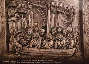 Dal dossale, lo sguardo del visitatore e del turista si sarebbe indiscutibilmente posato sul PALIOTTO, ossia sulla parte inferiore dell’altare, su cui poggia la mensa, e sul suo rivestimento decorativo. Il suo nome, “paliotto”, deriva dal latino pallium (ossia mantello), e così come il classico paramento liturgico della Chiesa cattolica formato da una striscia di lana bianca abitualmente decorata con croci nere, anche il paliotto, come una sorta di prezioso mantello, riveste l’altare proprio come un abito e non di rado il paliotto di un altare veniva rivestito proprio da una preziosa stoffa. Nel caso del nostro prezioso altare argenteo dedicato al Santo Patrono, il paliotto, seppure con impronta molto diversa dal suo dossale, va ad uniformarsi con esso e a creare un tutt’uno di grande e complessa suggestione scenica. Sebbene lo storico dell’arte Carlo Lodovico Ragghianti abbia apertamente manifestato più di un dubbio riguardo alla paternità unica di questo manufatto rispetto a quanto tradizionalmente attribuito (ipotesi affatto peregrina considerate le varie ricomposizioni subite dal