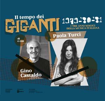 Infine, chiusura in bellezza, martedì 30 luglio (ore 21.15) con IL TEMPO DEI GIGANTI, il nuovo progetto artistico di Paola Turci e Gino Castaldo (giornalista de “la Repubblica” sin dal 1976) che promette di raccontare come mai prima d'ora il triennio magico della musica italiana, gli anni 1979, '80 e '81 di Dalla, Pino Daniele, De André, Vasco Rossi, Battiato, Rino Gaetano, Battisti e tanti altri. Uno spettacolo fatto di parole e musica, intrecciato di ricordi, analisi e interpretazioni dal vivo, che ricrea sul palco l’energia vibrante del periodo, tra materiali d’archivio e performance live.