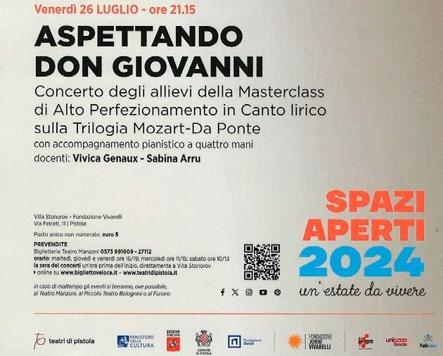 ASPETTANDO DON GIOVANNI, il concerto degli allievi della Masterclass di Alto Perfezionamento in Canto lirico sulla Trilogia Mozart-Da Ponte con accompagnamento pianistico a quattro mani. La Masterclass, tenuta dalle docenti Vivica Genaux e Sabina Arru, promossa da Teatri di Pistoia, è in programma dal 23 al 30 luglio alla Villa Puccini a Scornio (info su www. teatridipistoia.it).