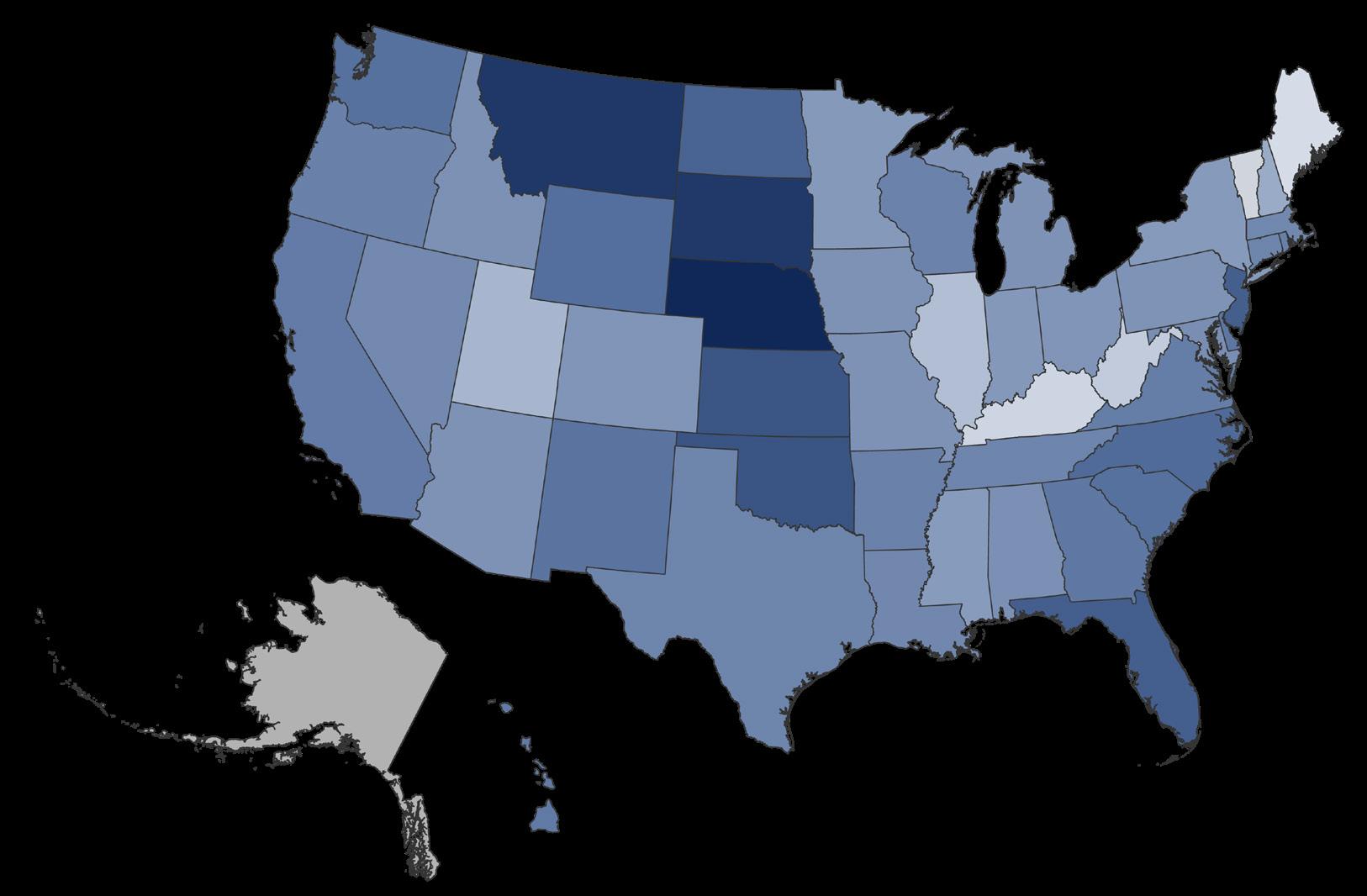and Nebraska score high for percentage of state area with at-risk ecosystems. In mountainous western states, there is a high diversity of ecosystems but those that are at risk are largely limited to low elevations where the human footprint is greatest; thus, those states score relatively low for percentage of state area with at-risk ecosystems.