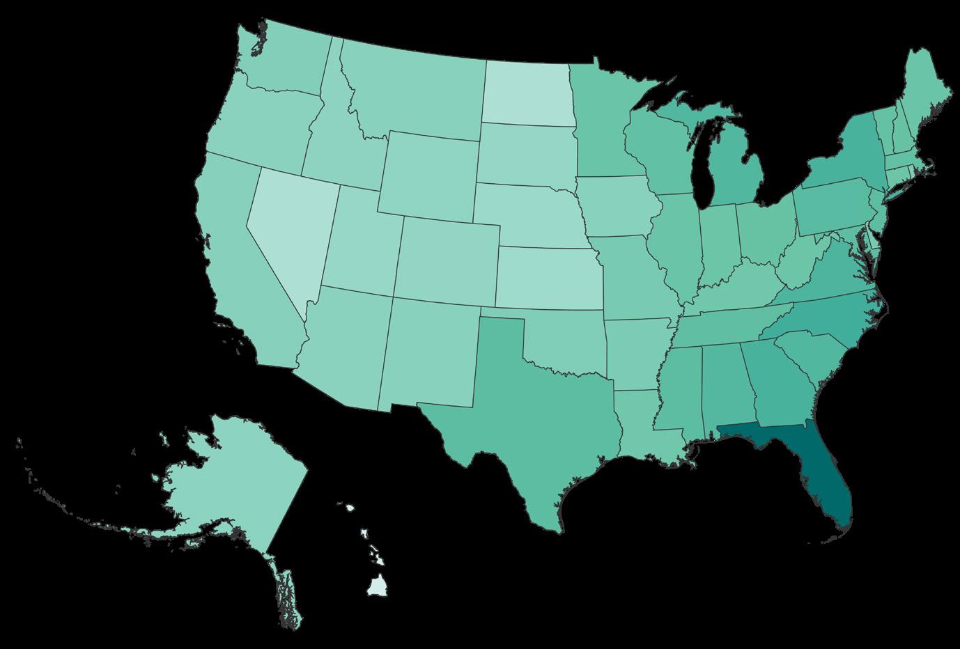 Geographical patterns for at-risk ecosystems reflect the legacy of human land use. The prevalence of at-risk ecosystems is high in the South, especially in Florida. In the western Great Plains, many states have relatively low ecosystem diversity, but contain large areas of at-risk grasslands. For example, Montana, South Dakota,