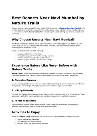 Nature Trails Resorts Pvt. Ltd. founded in the year 1989; is one of the pioneers in the business of Nature + Adventure Resorts, Campsites and Activity Camps. It owns and operates properties at 5 unique, unexplored yet easily accessible destinations close to metros such as Mumbai, Pune and Nashik & is well-known for its unique offerings to Schools, Corporates and families for over two decades now. Nature Trails is now a subsidiary of Sterling Holidays Resort Pvt. Ltd.
