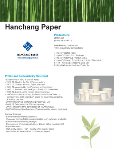 Hanchang Paper Product Line GREENUS (HANCHANG ECO) Love People, Love Nature. 100% Industrially Compostable! 1. Ingeo™ Coated Paper 2. Ingeo™ Coated Food Package 3. Ingeo™ Paper Cup (Various Sizes) 4. Ingeo™ Cutlery - Fork / Spoon / Knife / Chopstick 5. Film - Roll Bag / Shopping Bag, Etc 6. Sheet & Injection Molding Products