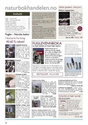 Fonstad m.fl. Boka med drøyt 250 av de vanligste fugleartene i Norge har med CD’er av 138 arter. Presentert under fuglesang (side 23). Tilbud kr 249 (før 339) Gyldendals store fugleguide - 3.utgave -revidert Den beste identifikasjonsboka på markedet. Svensson mfl, 448s. Nå utvidet og revidert i 2010. Presentert på baksiden av katalogen. Kr398