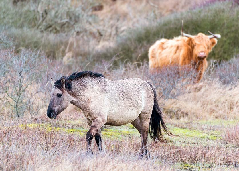 igenlijk zijn ze er nog maar kort, de Schotse hooglanders, galloways, koniks, IJslandse pony’s, taurussen en al die andere grote grazers die in de Nederlandse natuur rondlopen. Bosbouwers hielden hun bossen lange tijd graag verschoond van vee, de houtoogst stond voorop. Ook natuurbeschermers hielden zich in beginsel afzijdig; de natuur was gebaat bij rust. Na de Tweede Wereldoorlog veranderden de inzichten, zeker na de stormen van 1972 en 1973. Die hielden enorm huis in de aangeplante productiebossen. Er gingen steeds meer stemmen op voor een ander bosbeheer met meer natuurlijke processen. Begrazing met hoefdieren vormde daarbij een speerpunt. In Baronie Carendonck vond in 1972 een van de eerste experimenten plaats met IJslandse pony’s. Tien jaar later werden de eerste Schotse hooglanders losgelaten op de Veluwezoom. De uitkomsten werden positief beoordeeld. De grazers zorgden voor meer variatie in de natuur. Het bleek een startschot voor de komst van veel meer (halfwilde) hoefdieren, niet alleen runderen, paarden en pony’s, ook schapen en geiten. Vandaag de dag gaat het om vele tientallen rassen uit allerlei windstreken. Fokko Erhart, begrazingsexpert en hoofd