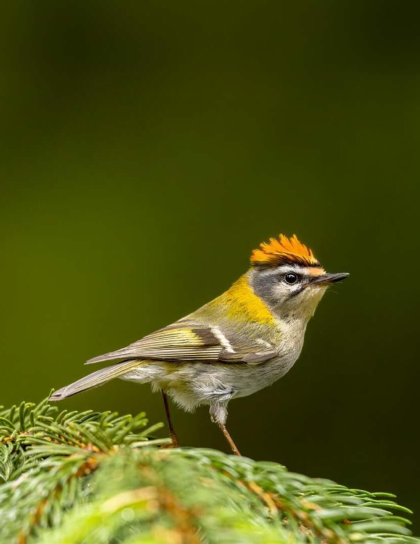 Een lichtgroen flitsje door het struikgewas is vaak het enige wat je ziet als je een vuurgoudhaan tegenkomt. Als je het geluk hebt om hem in de kijker te krijgen, valt de contrasterende witte wenkbrauwstreep op en daaronder een gitzwarte oogstreep. Dat onderscheidt hem van zijn broertje de goudhaan, die geen tekening heeft rondom het oog. De vuurgoudhaan is bijna het hele jaar in Nederland te vinden. Vanaf het