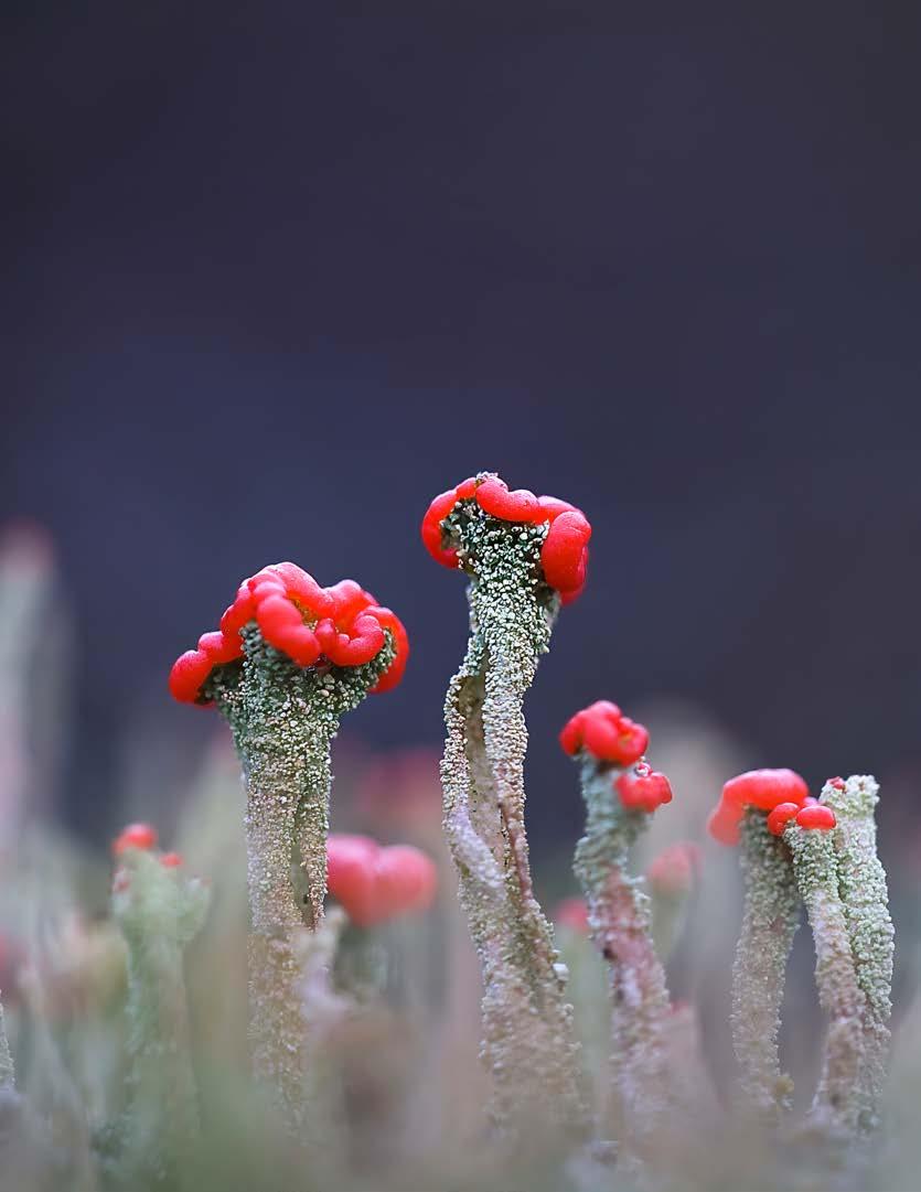 Lopend in de decemberkou over voedselarme heide en stuifzand zoals op het Veluwse Hulshorsterzand, is er genoeg te zien. Laag bij de grond moet je zijn. De rode kopjes van de heidelucifer staan op vaal grijsgroene, wat geschubde stelen. Je vindt ze op verrotte boomstobben en stammetjes hout of op de grond. Deze ‘paddenstoeltjes’ die geen paddenstoel zijn, maar korstmossen, ontstaan door samenwerking