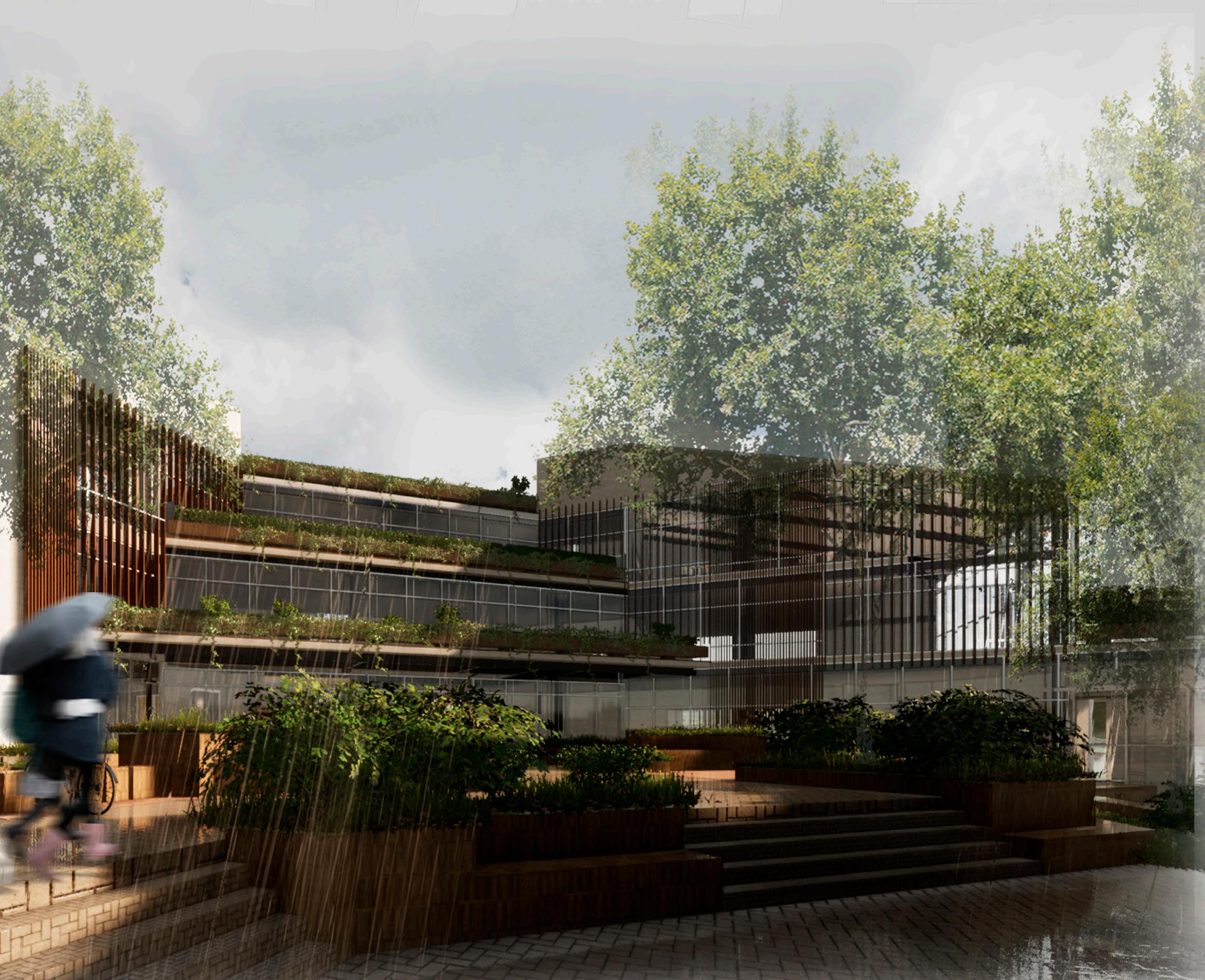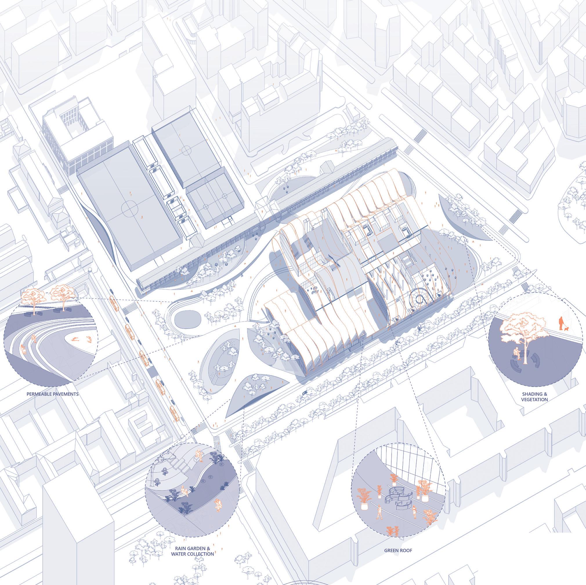 Angled roof allows better management of rain water to be collected and re used in green areas.