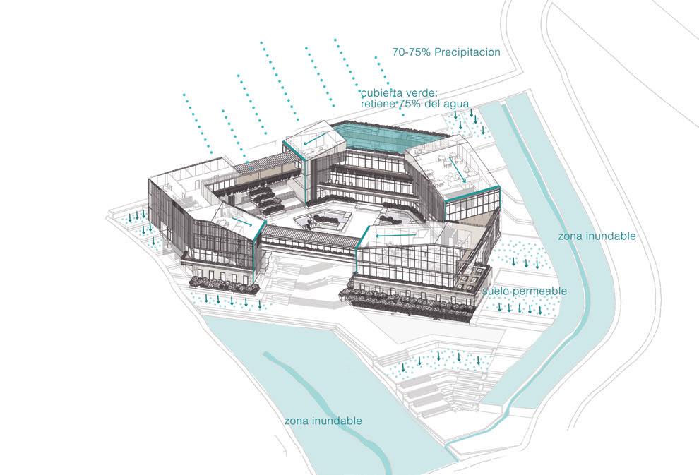 Since the project is located in a hilly place with a high slope, the water management of the project is divided by the intern system of water supply provided by collecting rainwater and the evacuation system which consist in conducting the extra amount of water along the slopes being filtered by SUDS and arriving to the river’s flow.