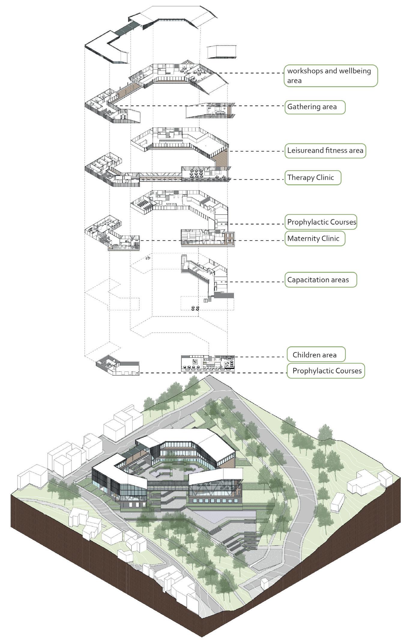 The project seeks to empower, value and provide tools for an integral development for women in a vulnerable state. This is achieved through education both on issues related to motherhood, as well as capacitations for their personal development. The program arises as a result of the research carried out, and its objective is to develop optimal spaces for specific activities. Therefore, the equipment is made up of 2 main themes, training and support, which are articulated with shared uses and open spaces.